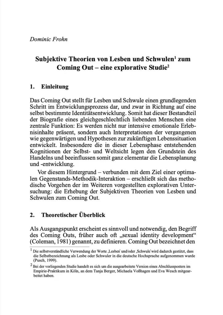 Das Coming Out stellt für Lesben und Schwule einen grundlegenden Schritt im Entwicklungsprozess dar, und zwar in Richtung auf eine selbst bestimmte Identitätsentwicklung. Es werden nicht nur intensive emotionale Erlebnisinhalte präsent, sondern auch Interpretationen der vergangenen wie gegenwärtigen und Hypothesen zur zukünftigen Lebenssituation entwickelt. In vorliegender Forschung wird dieser prägende Schritt näher in den Blick genommen und Subjektiven Theorien von Lesben und Schwulen zum Coming-Out explorativ untersucht.